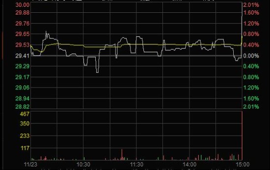 2011年11月23日临近收盘期间(14:56:24至14:59:28),任某某为了在短期内拉升股价,大量申报买入“X”4笔共计63,000股,占尾市阶段市场申买量的比例高达75.54%;委托价格由29.60元升至32.00元,每笔均高于当时市场上的买1档价格,三分钟内将股价由29.35元拉升至30元收盘,拉升幅度达2.21%。(见下图)