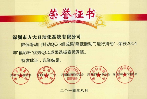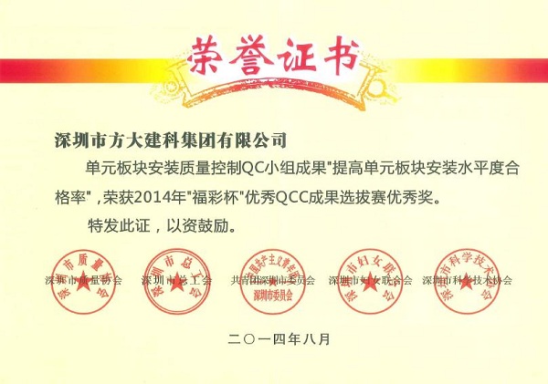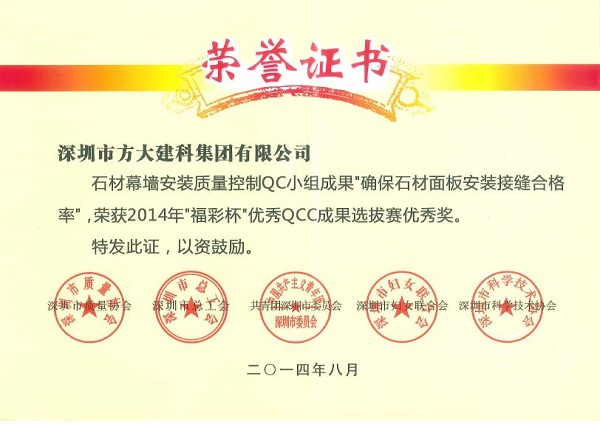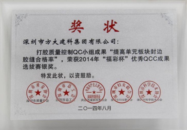 9月26日,方大建科公司获得由深圳市质量协会、深圳市总工会、共青团深圳市委员会、深圳市妇女联合会和深圳市科技技术协会联合颁发的“2014年深圳市质量管理小组活动优秀企业”称号。同日,由深圳市质量协会、深圳市总工会、共青团深圳市委员会、深圳市妇女联合会和深圳市科技技术协会联合评定的“福彩杯”优秀QCC成果优秀奖揭晓。方大建科公司打胶质量控制QC小组成果“提高单元板块封边合格率”荣获2014年“福彩杯”QCC成果选拔赛银奖,方大建科公司单元板块安装质量控制QC小组成果“提高单元板块安装水平度合格率”,方大建科公司石材幕墙安装质量控制QC小组成果“确保石材面板安装接缝合格率”、 方大自动化公司门机梁皮带夹改造QC小组成果“提高门机梁传动系统组装合格率及使用寿命率”荣获“深圳市2014年‘福彩杯’QCC成果选拔赛优秀奖”, 集团公司企业管理部尚清荣获“深圳市质量管理小组活动卓越领导者”称号,方大建科公司张锦德荣获“深圳市质量管理小组活动优秀推进者” 称号。