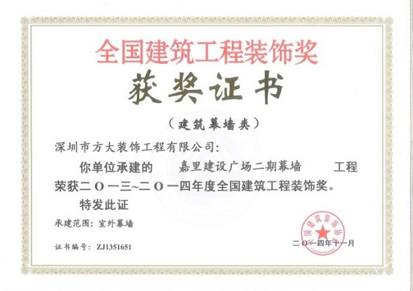“2013-2014年度全国建筑工程装饰奖”获奖结果在北京揭晓,深圳市方大建科集团有限公司荣获四项建筑幕墙类大奖,获奖项目分别为:中铁南方总部大厦幕墙工程、大连万达公馆1#楼幕墙工程、嘉里建设广场二期幕墙工程、中广核大厦幕墙工程。