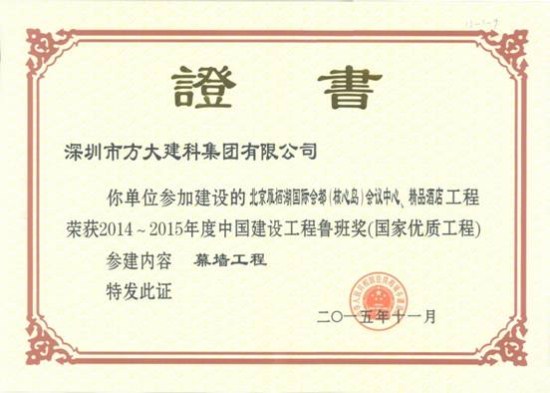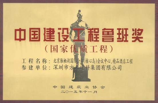 11月17日,中国建筑业协会在北京举行中国建筑行业最高奖——2014~2015年度中国建设工程鲁班奖(国家优质工程)表彰大会,在本届鲁班奖表彰大会中,智博体育在线app官网全资子公司深圳市方大建科集团有限公司凭借精心打造的高标准、高质量幕墙工程的北京雁栖湖国际会都精品酒店,获得2014~2015年度中国建设工程鲁班奖,“方大品质”作为“深圳质量”的典范再度被全国建筑工程领域所瞩目。