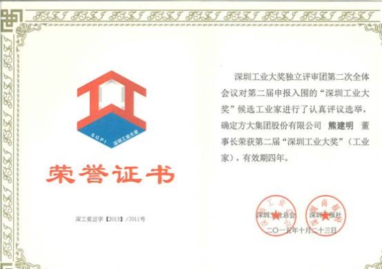 熊建明董事长荣获第二届“深圳工业大奖”工业家奖(证书)