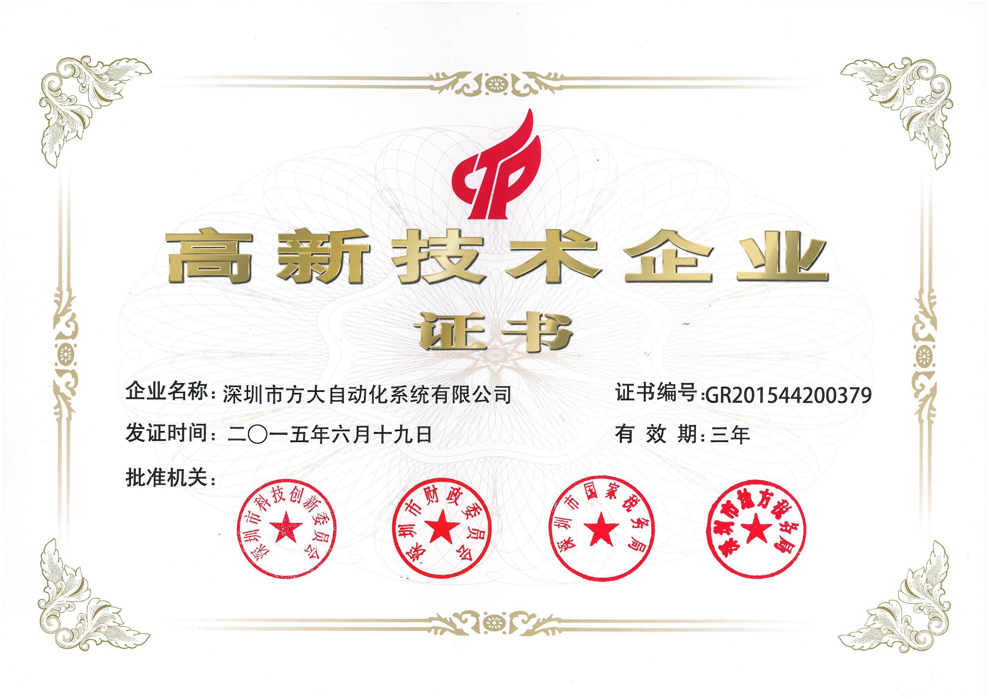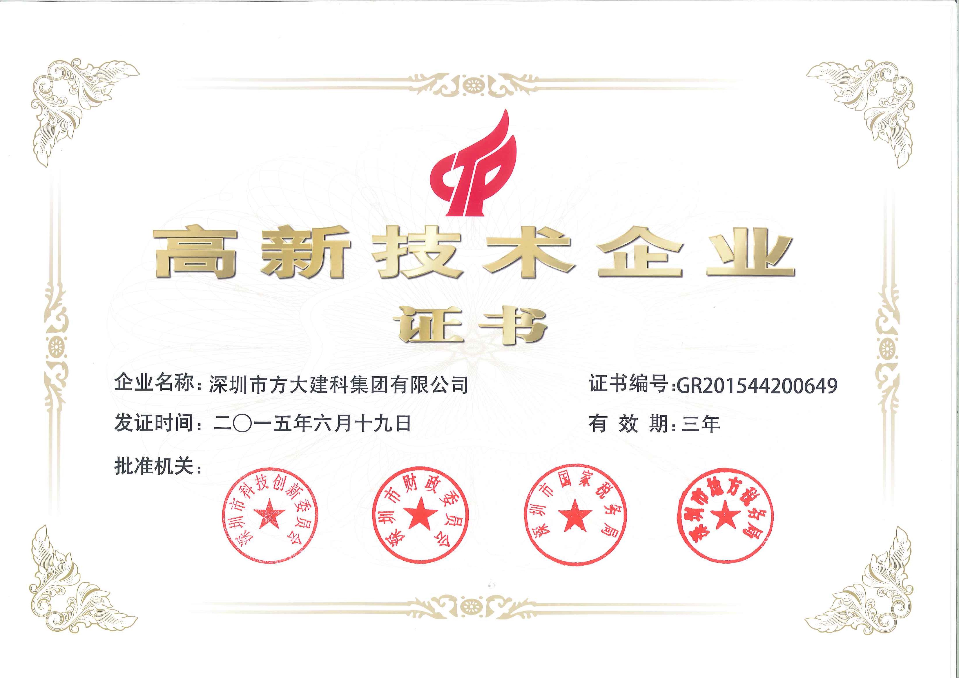 近期,根据科技部、财政部、国家税务总局《高新技术企业认定管理办法》和《高新技术企业认定管理工作指引》的规定,经企业申报、地方初审、专家审查、公示等严格的申报程序,智博体育在线app官网全资子公司深圳市方大建科集团有限公司、深圳市方大自动化系统有限公司被认定为国家高新技术企业,成为深圳市2015年第一批国家高新技术企业。