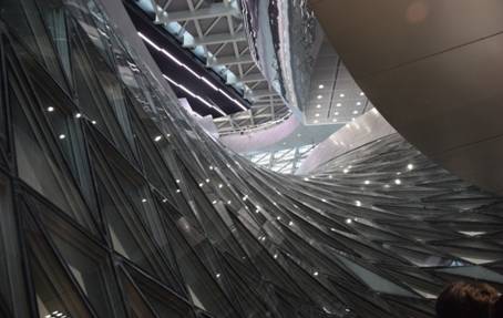 别具匠心体现创新能力。本项目的另一大亮点就是室内的云雕塑下方的勺子幕墙系统,因为其形状像一把汤勺而得名,其实是一个双面双层扭曲的、兼具防火隔断功能的室内幕墙系统,该幕墙的主体异形钢结构由方大人设计、施工完成,工期只用了30天。