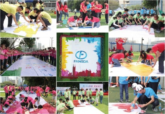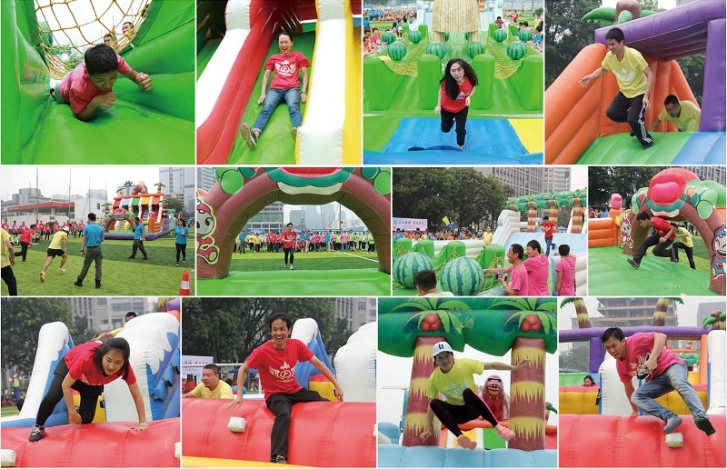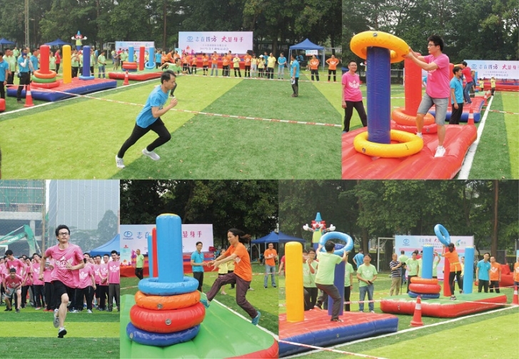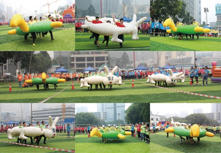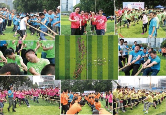 本次运动会设置了龟兔赛跑、超级汉诺塔、快乐gogogo、趣味拔河、纳斯卡巨画等趣味项目,比赛场上处处充满着欢声笑语,大家玩得不亦乐乎!在龟兔赛跑环节,各代表队的队员们分别顶着巨型充气“乌龟”、“兔子”笑着跑着,奋力竞争,争取最好的比赛成绩;在超级汉诺塔环节,考验的不仅有团队成员的运动能力,还有团队内部的组织协作效率;在快乐gogogo环节,更是掀起了所有参赛员工的火热激情,他们在气垫城堡中穿梭、攀爬、滑行、滚动,在回味和体验孩童时代乐趣的同时,为自己的团队争取好的名次;趣味拔河环节是这次运动会的最高潮,只见加油的叫喊声震天动地,拔河的队员无不神态激越,使出浑身之力,将拔河绳拉得吱吱地响;最后是纳斯卡巨画环节,参与运动会的全体员工一同用五颜六色的油彩,分工合作,共同绘出印有智博体育在线app官网logo的巨型图画。通过百米高空上无人机的航拍我们看到,在530余名方大人簇拥中的方大logo巨画,在灿烂阳光的照耀下,正闪闪发光,正如她在行业中的响亮知名度一样。
