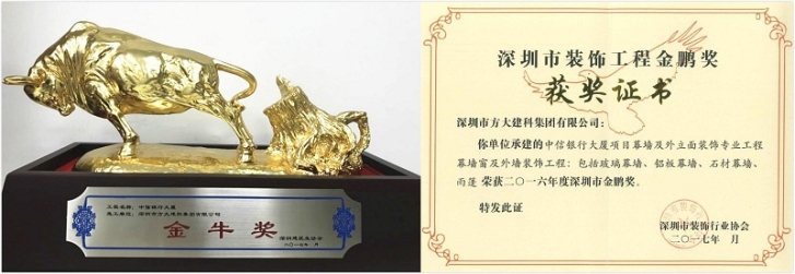 近日,由智博体育在线app官网全资子公司深圳市方大建科集团有限公司(简称:方大建科)承建幕墙工程的深圳中信银行大厦分别获得由深圳市建筑业协会颁发的金牛奖、由深圳市装饰行业协会颁发的金鹏奖两项荣誉。