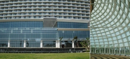 该项目由国际会议中心(包括大会议厅、中小会议厅、休息大厅、贵宾休息厅、主宴会厅及附属设施)、音乐厅及酒店组成。国际会议中心地上6层,最大建筑标高为41米;五星级酒店地上18层,最大建筑标高为81.3米;幕墙面积达90200平方米。该项目幕墙系统由肋点式玻璃幕墙、横明竖隐玻璃幕墙、竖明横隐玻璃幕墙、石材幕墙、铝合金推拉门、铝板吊顶及挑檐、采光顶、金属屋面、铝合金格栅、铝合金百叶、玻璃栏板及玻璃雨蓬等组成,幕墙造型复杂多样。方大团队在生产制造环节采用多种新工艺,确保幕墙材料质量过硬且供应高效。