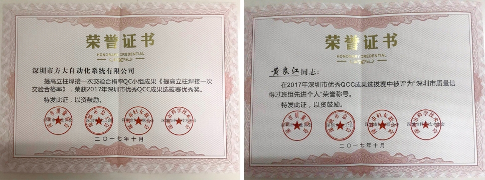 “2017年深圳市优秀QCC成果选拔赛优秀奖”是由深圳市质量协会、深圳市总工会、深圳市妇女联合会和深圳市科学技术协会联合审定,旨在表彰在2017年深圳市质量管理小组活动中涌现出的优秀企业、QC小组和个人。