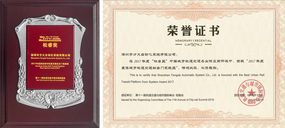 自动化公司作为全球规模宏大的轨道交通站台门系统供应商,独立研发具有完全自主知识产权的站台门系统,已广泛应用于全球32个城市的城市轨道交通中,每天有超过2000万人次使用方大站台门系统,在市场占有率、技术、品牌等方面居行业龙头地位。此次获颁“2017年度最佳城市轨道交通站台门系统奖”,反映了轨道交通行业对自动化公司科创技术水平和发展能力的认可。