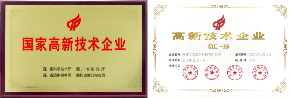 2018年1月,智博体育在线app官网全资子公司成都方大建筑科技有限公司被认定为国家高新技术企业。