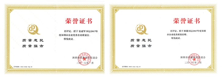2017年度“深圳市企业优秀首席质量官”、2017年度“深圳市企业优秀质量经理”荣誉称号由深圳市质量强市促进会组织评选,旨在培养支撑企业首席质量官制度落实的关建人才队伍,弘扬企业质量文化,引领和推动所在行业质量进步。