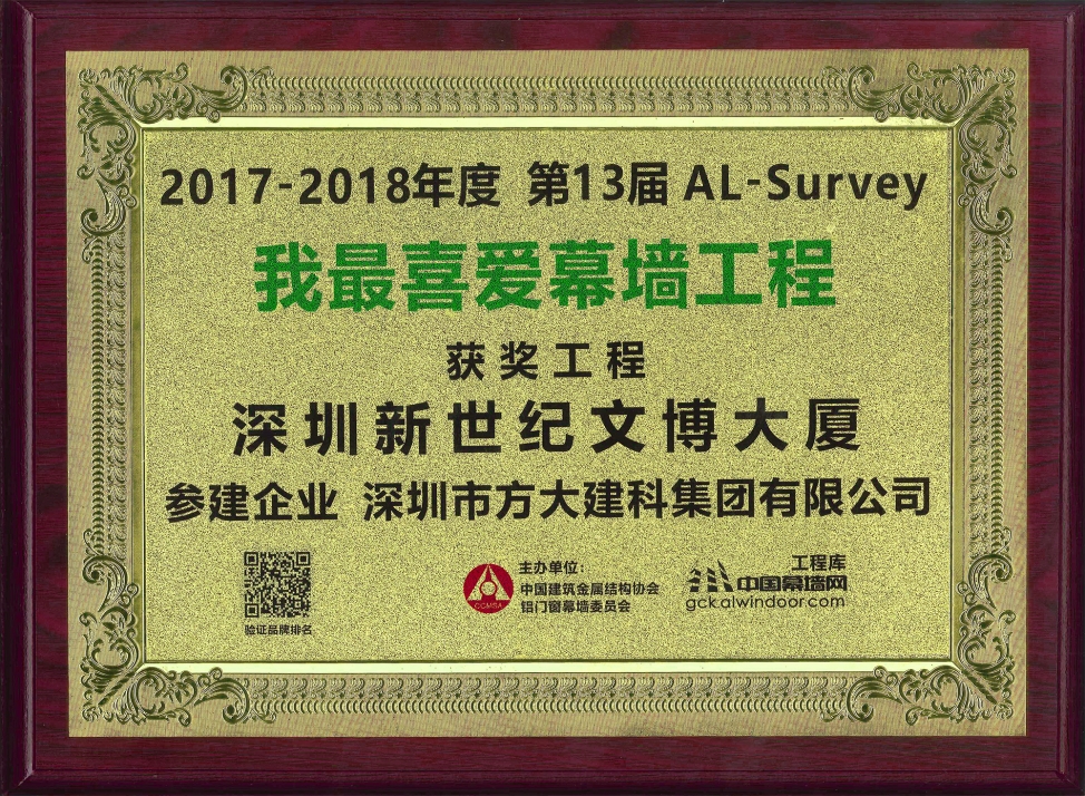 第13届“我最喜爱幕墙工程”评选活动由中国建筑金属结构协会铝门窗幕墙委员会、中国幕墙网联合发起,经广大网友投票及专家评审,方大建科承建幕墙工程的深圳新世纪文博大厦最终以216740的高票和专家五星评价获奖。