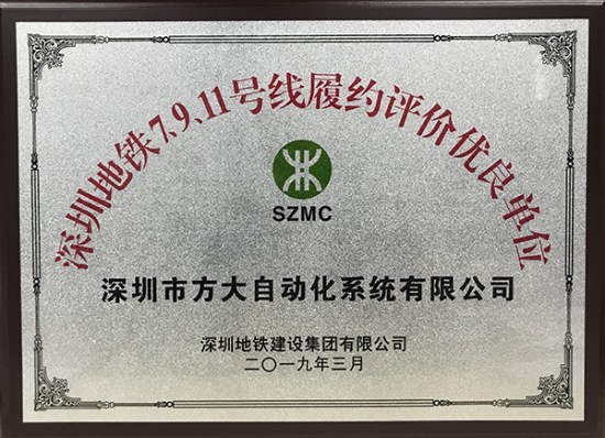 近日,深圳地铁建设集团有限公司授予智博体育在线app官网全资子公司方大智创科技有限公司(原深圳市方大自动化系统有限公司)“履约评价优良单位”奖。
