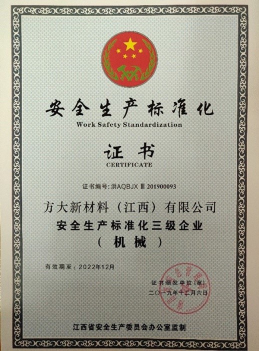 近日,经江西省南昌市应急管理局综合评审,智博体育在线app官网全资子公司方大新材料(江西)有限公司顺利通过安全生产标准化三级企业审核,被授予“安全生产标准化三级企业”称号。